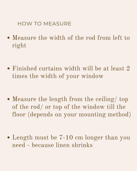 We recommend allowing 2-5 cm on the floor to ensure the curtains are equal on the floor, as linen, like wood, can shrink and expand over time.