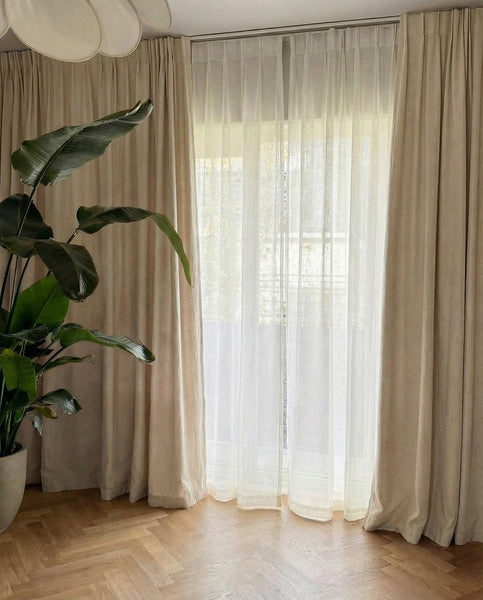 We make made-to-measure linen curtains with blackout lining from 100% natural linen. Choose blackout for maximum light blocking or dimout for softer light reduction. Send us a quote request with your measurements and we’ll reply within 24 hours with detailed calculations and the recommended number of panels.