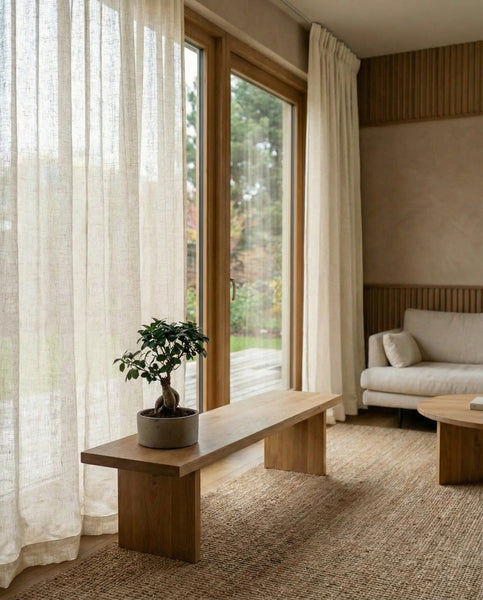 The density of our Linen Sheer Curtains is 90–100 g/m², which creates some privacy while still allowing natural light through. Linen width: 145 cm.